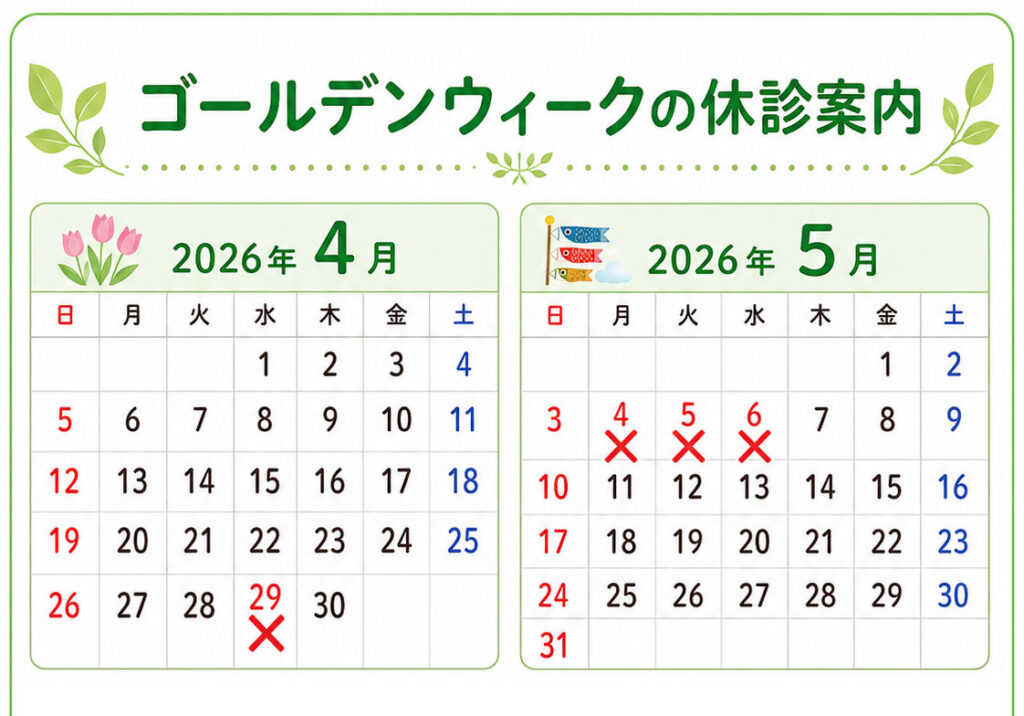 ゴールデンウィークの休診案内について 未分類 2026.04.28 4/29水曜日、5/4月曜日から5/6水曜日の期間がお休みとなります。ご迷惑をおかけいたしますが、どうぞよろしくお願いいたします。5/7木曜日からは通常診療となります。